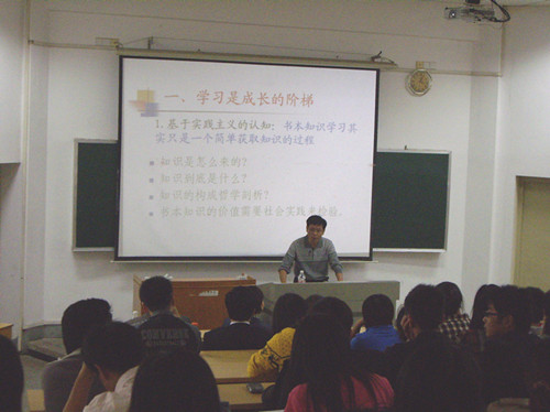 侯家骥首先从“学习是成长的阶梯”、“人才是国家核心竞争力”、“创新思维培养”这三大方面出发,着重谈及了素质教育与人才创新的重要意义。在讲解中,他运用科学合理的世界观与方法论分析出我国考试制度的弊端、人才培养的局限性及东西方教育体制差异等问题,让同学们深刻领会“应试能力与实践创新能力不能划等号”的道理。他还鼓励同学们要善于激发自身的创新性思维,注重综合实践能力的运用,最好能利用哲学的理论去解决我们生活中所面临的各种问题,以此得到自我锻炼、获得成长。讲座结束前,侯家骥让同学们针对“为何外省农民在湖南种地致富”这一问题展开自由讨论,还借助线性图形为同学们生动地阐述了问题产生的原因,引发同学们对此进行深入探索。