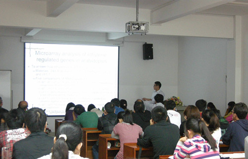 报告会上,钟广炎研究员首先介绍了柑橘乙烯基因的发现,并说明了乙烯在柑橘中的反应机理以及两个相关的操控基因,同时还介绍了SNP分子标记及其在柑橘中的应用,报告了他多年的研究成果。报告会后,钟博士与在场的师生进行互动交流,并解答了学生的疑问。