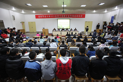在第24个世界艾滋病日到来之际,为了贯彻落实《国院务防艾滋病工作委员会办公室关于开展2011年世界艾滋病日活动通知》(国艾办函〔2011〕24号)和《教育部卫生部关于进一步加强学校预防艾滋病教育工作的意见》(教体艺〔2011〕1号),由校团委和长沙市芙蓉区疾病控制中心主办,校医院、校学社联承办的湖南农业大学2011年世界艾滋病日宣传周活动启动仪式12月1日上午在文渊馆一楼会议室隆重举行。启动仪式由校医院副院长宋宇主持,长沙市芙蓉区疾控中心主任张运秋、副主任胡辉伍,校学工部、团委、医院有关负责人及150名大学生参加了启动仪式。