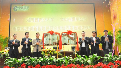 校长周清明、副校长曾福生、烟草研究院院长周冀衡教授,云南文山州人民政府副州长胡荣,文山州烟草局(公司)局长张树锋等出席揭牌仪式并分别致词,教师和学员代表也在大会发言。会上还举行了文山州人民政府聘任湖烟草研究院院长周冀衡教授为“烟草和区域经济发展战略顾问”的聘书颁发仪式。文山州政府部门领导和烟草公司全体班子成员,烟草硕士研究生班全体学员、烟草公司机关干部参加了揭牌仪式。