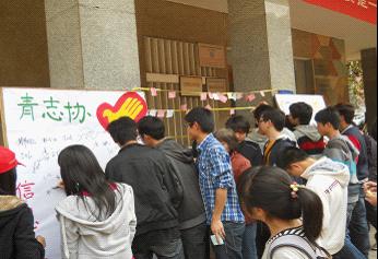 活动中,伴随着“感恩的心”背景音乐,同学们把饱含真挚感情和感恩之心的话语写在一张张五颜六色的小卡片上,用回形针编系悬挂在黄丝带上,并在印有活动主题的展板上留下了自己的名字和祝福。