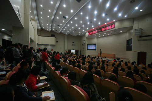 3月28日晚七点,商学院在图书馆大成厅举办了新东方四六级英语专场讲座。主讲老师是新东方明星讲师唐思宇、宋智鸣、季云竹。唐思宇讲解了提高四六级英语听力与阅读的相关技巧;宋智鸣讲解了学习英语的基本方法;季云竹对四六级英语考试词汇方面的知识进行了讲解。