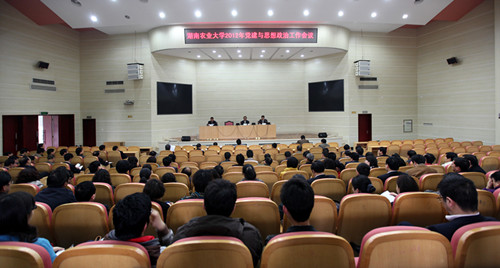 3月29日下午,学校2012年党建与思想政治工作会议在图书馆大成厅召开。会议由党委副书记彭克勤主持。党委书记刘强、校长周清明,副校长符少辉、卢向阳、方逵、陈岳堂,纪委书记周仲文,副校长王湘,副校级督导员易自力,正校级督导员吴立新,副校级督导员唐汇国,校长助理、改革发展处处长张立,校纪委委员,党群部门副处级以上干部,行政部门主要负责人,各党总支部(分党委)书记、副书记、委员,各学院院长,校院两级关工委正副主任 ,学生会主席,社团联会主席参加了会议。