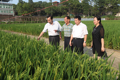 校党委书记周清明、校长符少辉陪同袁隆平院士考察超级杂交稻(图)