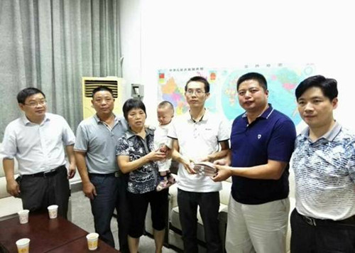 本网讯(生科学院 刘靖)8月28日,在我校文渊馆会议室中,深圳校友会谷育林秘书长在我校校友办胡茂丰主任、学工部戴荣四部长和生科学院刘逊副书记的陪同下,将56000元爱心捐款交到了我校校友欧阳琳手上。