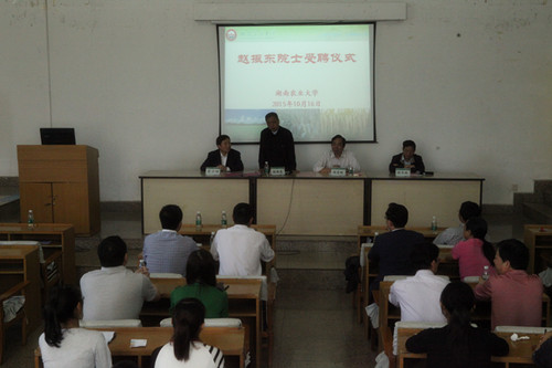 本网讯(农学院 汤帮耀)10月16日上午,学校在文渊馆一楼会议室隆重举行仪式,聘请赵振东院士为我校“双聘院士”。仪式由陈冬林副校长主持,学校党政办、宣传部、人事处、科技处、教务处、研究生院(部)、校友办、南方粮油作物协同创新中心负责人、农学院院领导及师生代表等100余人参加了本次活动。