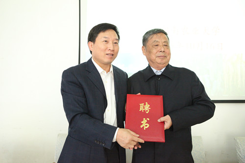 符少辉校长与赵振东院士签定聘任协议书,宣读并颁发聘书后,赵振东院士发言,他满怀深情地回顾了自己在湖南农业大学的学习经历,感谢母校对他的培养,同时他还介绍了自己所做的工作,并用“敢不从否”的幽默话语表达了愿意为母校发展效力的决心。