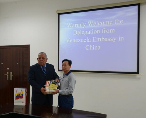 易宣副处长代表我校国际交流与合作处向委内瑞拉来宾赠送礼品。