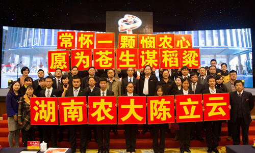 在颁奖典礼中,陈立云教授表示参加工作的时候条件非常艰苦,到广西、海南出差经常七八个月都不回来。田间干活和做饭等都要靠自己,农民能够做的,全部都要做;农民不用做的,他们还要做。但为了国家,为了农民,这都是非常值得的。陈立云教授寄语学生:国家和人民的利益高于一切,年轻人要有理想、抱负、追求,要老老实实做人,踏踏实实做事。并用湖南农业大学的校训“朴诚、奋勉、求实、创新”和学生们共勉。