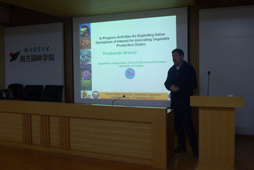 本网讯(园艺园林学院 汤丹 彭淼)12月7日上午,园艺园林学院特邀意大利卡塔尼亚大学农业、食品与环境系教授Ferdinando Branca举办了主题为 “In progress activities for exploiting Italian germplasm of interest for innovating vegetable production chains”的讲座,果树系邓子牛教授担任主持人并进行翻译。副院长甘德欣教授、蔬菜系刘明月教授等出席,园艺学一级学科部分教师、全体研究生、本科生代表参加了讲座。