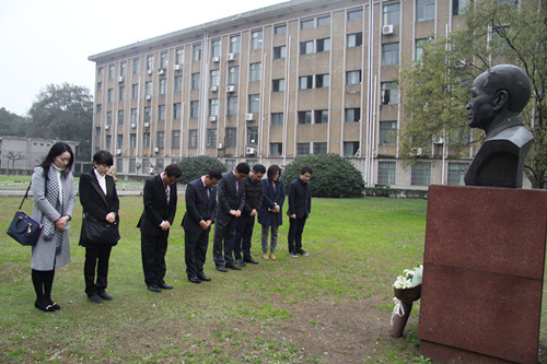韩国来宾在柳子明教授铜像前献花致敬