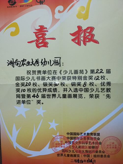 本网讯(幼儿园)12月21日,农大幼儿园选送80名幼儿作品参加了世界儿童画展组织的《少儿画苑》第22届国际少儿书画大赛。组委会传来喜讯,农大幼儿园获得特别金奖12枚、金奖20枚、银奖30枚、铜奖8枚、优秀奖10枚的优异成绩。邓茗予、邓维和王婷老师获得组织辅导金奖。组委会授予农大幼儿园“百佳艺校”和“先进单位”的光荣称号。
