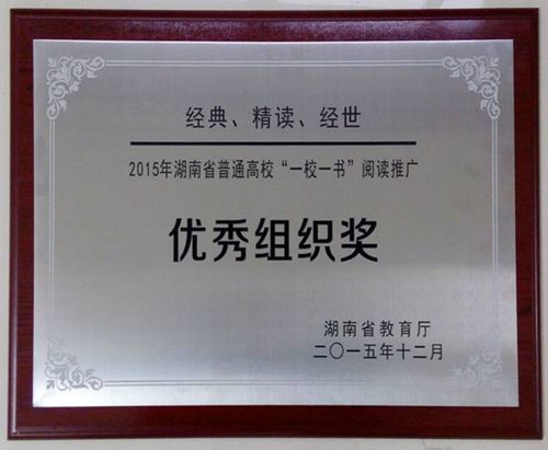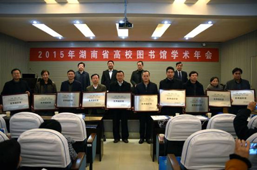 湖南大学分管图书馆工作的曹一家副校长致辞。省教育厅葛建中副厅长对2015年“一校一书”阅读推广活动进行了总结。他高度肯定了湖南省各高校在2015年“一校一书”阅读推广活动中所取得的成绩,指出了湖南省高校图书馆普遍存在现代化水平不够高、专业队伍不够优、作用和地位有边缘化的趋势等问题,希望各高校图书馆要把握发展趋势、主动服务、在继承优良传统的基础上不断提升服务能力,打造一个培养大学生养成良好阅读习惯、教会大学生搞科研的好平台。他宣读了获奖单位名单并和与会其他领导一起为获奖单位颁奖。我校图书馆荣获湖南省教育厅颁发的2015年“一校一书”阅读推广活动优秀组织奖及湖北省高校图工委颁发的“首届全国高校图书馆阅读推广案例华中赛区优秀奖”。“学霸沙龙”在2015年湖南省22所普通高校“‘一校一书’——经典、精读、经世”阅读活动中展露头角,荣获“创新案例奖“,我校是拥有此殊荣的5所高校之一。