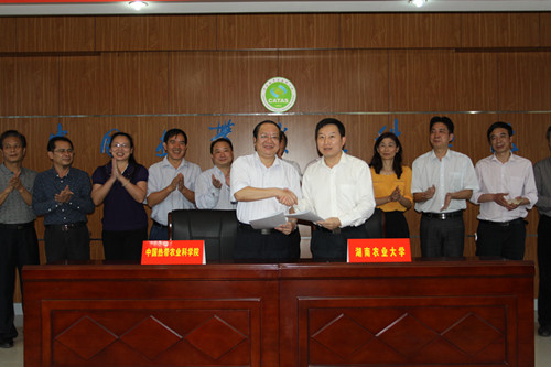 据了解,中国热带农业科学院是农业部直属科研机构,农业部直属“三院”之一,承担着我国热带农业科学发展中的全局性、基础性、关键性和方向性的重大科技任务。根据协议,双方将本着“优势互补,资源共享,互惠双赢,共同发展”的原则,在作物学、生物学、植物保护、园艺学、食品科学与工程、农业资源与环境等领域共建一批优势学科,建设人才联合培养基地联合培养研究生或本科生、共建共享一批重点实验室等科技平台和科学数据、文献资源,同时,还将瞄准国家重大科学问题和关键技术难题,联合申报、承担一批重大科技课题,协同推广一批实用技术。此次“校所”联姻必然为我校农业科学的发展注入新的动力,筑起我校农业科学发展的新平台,开启“校所”共赢合作的新局面。