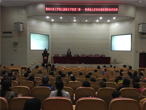 本网讯(幼儿园 杨大鹏)进入春季传染病高发季节,很多幼儿由于免疫力低下、卫生习惯不良等各种原因造成感染。为了增强家长保健知识,提高幼儿疾病预防能力,3月17日晚,农大幼儿园邀请到芙蓉区妇幼所儿保科张伟红主任在学校图书馆大成厅举行了“春季幼儿常见传染病预防”知识讲座。