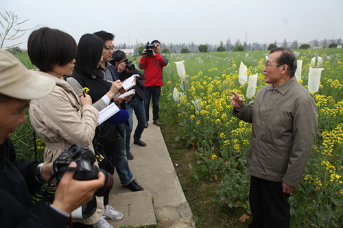 在耘园油菜科研基地,官春云介绍油菜栽种技术和最新研究进展