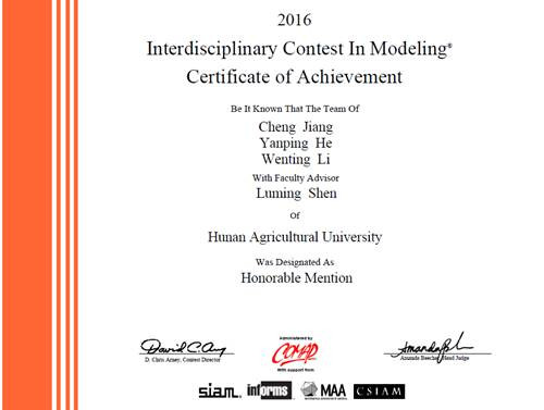 本网讯(理学院 王访)4月12日,从美国大学生数学建模竞赛与交叉学科数学建模竞赛(MCM/ICM)网站传来喜报,我校由何燕平、李文婷、姜成同学组成的代表队获得国际二等奖(Honorable Mention)。这是我校学生首次参加MCM/ICM竞赛并获得佳绩。