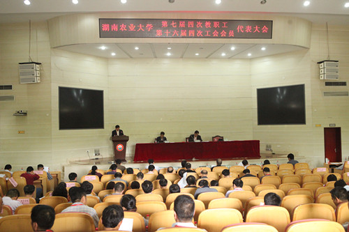 本网讯(校工会 梁洁)4月15日下午,湖南农业大学第七届四次教代会暨第十六届四次工代会在图书馆大成厅隆重举行。大会由校党委副书记、校工会主席卢向阳主持。180多名正式代表和特邀列席代表出席了会议。与会代表认真听取了校长符少辉所作的《学校工作报告》、副校长陈岳堂所作的《学校财务工作报告》以及校工会的《学校提案工作报告》和《学校工会工作报告》。校党委书记周清明就《湖南农业大学“十三五”发展规划》(审议稿)编制过程和基本框架向大会进行了说明。