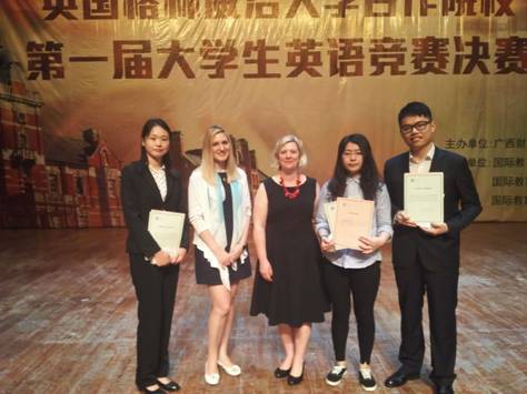 本网讯(国际学院 邓林竹 陈岳文)英国格林威治大学中国合作院校第一届英语竞赛决赛于4月15日在广西财经学院举办。湖南农业大学、安徽大学、开封大学、广西财经学院和黑龙江工程学院5所院校参加了比赛。我校国际学院书记聂庆益、副院长张玉上及英语教师邓林竹带领陈俊霖、孙子童、赵意凡三位学生参赛并获奖。