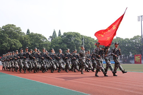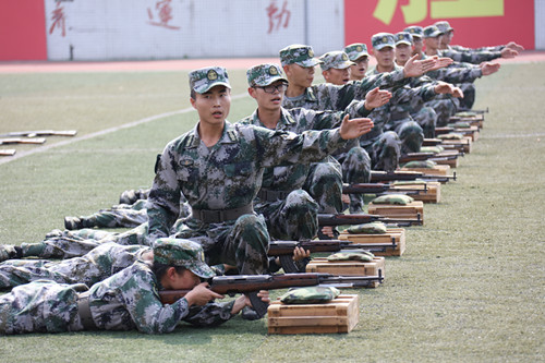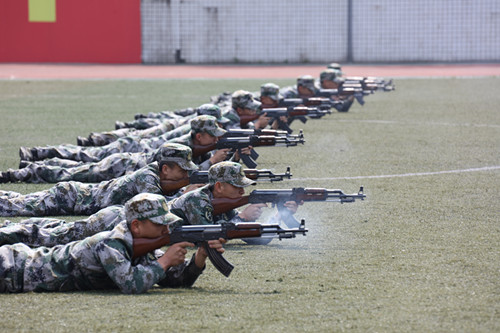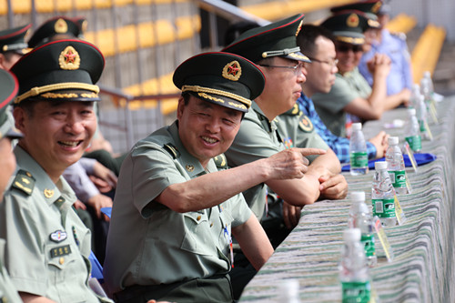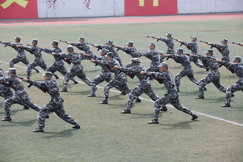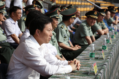 下午3时许,军委国防动员部政工局卢玉杰副主任,省委常委、省军区司令员黄跃进少将,省军区副政委刘建新少将,省军区参谋长郭辑山少将及军区机关团以上干部,全省14个地州市主管武装工作的副市长及各警备区(军分区)司令员、政委,全省122个区(县)人武部军政主官一行180余人驱车到我校东田径场观摩了由学生纠察队组织的军事训练科目演示。演示科目包括捕俘拳、战术、刺杀操、队列、枪械讲解、战地救护等。当纠察队英姿飒爽、排山倒海般的分列式方阵通过主席台时,全场庄严肃穆,自发报以热烈的掌声。