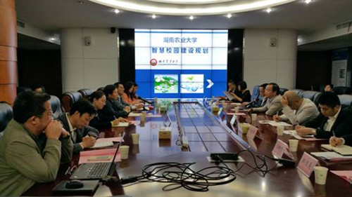 本网讯(信息化建设与管理中心 曹晖)5月9日下午,中国农业银行湖南省分行陶伟梁副行长、机构业务部周贫总经理、营业部徐源总经理、电子银行部王建平总经理及相关部门、长沙县支行的主要负责人等一行12人来我校调研洽谈。校长符少辉,副校长陈岳堂、段美娟,党政办、计财处、资产处、资产经营中心、信息中心等单位负责人参加座谈调研。会议由陈岳堂副校长主持。