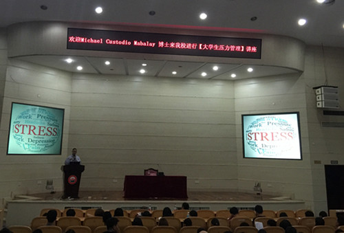 5月19日下午,MICHAEL CUSTODIO MABALAY博士在大成厅的讲座主题为“大学生压力管理”。他为学生们分析了压力的种类和表现形式,讲授了很多管理压力的方法。
