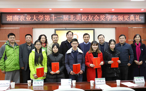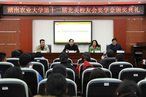 本网讯(学工部 蒋书琦 涂梓颖)11月23日下午,第十二届北美校友会奖学金颁奖典礼在十教北417室隆重举行。校党委书记周清明,副校长张立,北美校友会会长王爱兵教授、副会长周晓春董事长,校友代表张俊平教授,校友工作办公室主任胡茂丰、研究生工作部部长钟晓红、学生工作部部长戴荣四,农学院、植保学院、园艺园林学院、商学院、动医学院副书记出席了典礼。第十二届北美校友会奖学金获得者以及相关学院学生代表参加了本次典礼。学生工作部部长戴荣四主持。