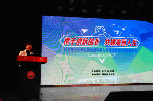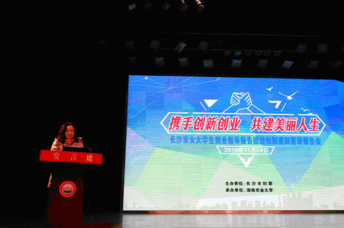 本网讯(创新创业教育中心 喻波)11月24日上午,由长沙市妇女联合会主办,我校承办的“携手创新创业,共建美丽人生”—2016年长沙市优秀创业女性进校园巡回宣讲报告会在学校大礼堂举行。长沙市妇联党组书记、主席谭慧慧,副校长张立等领导出席了报告会。
