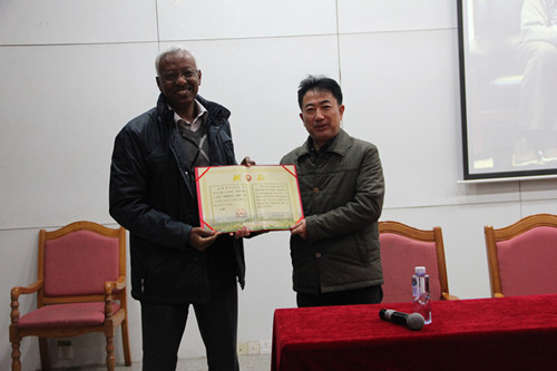 在11月24日上午举行的湖南省“外国专家百人计划”的受聘仪式上,我校曹福祥副校长为Ismail教授颁发了中英文聘书并对Ismail教授的来访表示热烈欢迎。周清明书记表示,希望在Ismail教授的带领下,帮助我校的“农业资源与环境”学科尽快地成为国内外一流学科。下午,Ismail教授参观了资源环境学院相关实验室并与团队成员和学生就团队任务和进展进行了深入探讨。