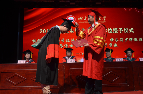 校研究生学位评定委员会副主席、副校长、邹冬生宣读了《湖南农业大学研究生学位授予决议》,校博士、硕士学位评定委员会主席、校长符少辉庄严的为72博士学位获得者逐一拨流苏并颁发博士学位证书,官春云院士和校领导为硕士学位获得者拨流苏并颁发学位证书。