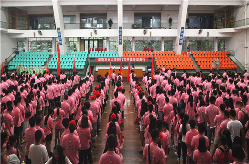 本网讯(学工部 邹晓卓 李珊)新学期,秋高气爽,农大校园,粉蝶飞舞。为践行社会主义核心价值观,创建全国文明校园,营造健康文明的校园文化氛围,全力推动学风建设和园区精神文明建设工作,9月3日上午8:00,湖南农业大学校园文明倡导周周行活动启动仪式在体育馆隆重举行。校党委委员、副校长张立、学工部部长戴荣四、学工部副部长唐琳、学生工作部学生管理科老师,各学院园区专干辅导员、校学风文明督导队全体队干、各学院主席、院学风文明督导队队长及学生代表620余人参加了本次仪式。仪式由学生工作部戴荣四部长主持。