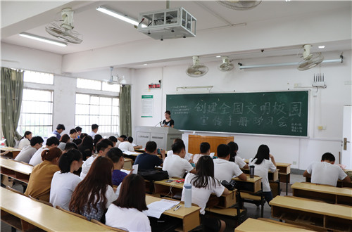 本网讯(学工部 胡喜海 桂凌云)9月14日下午,为积极响应学校创建全国文明校园的号召,各学院、各班级利用星期四下午第7,8节课的政治理论学习时间,分别在七教、九教、十教各教室,以及图书馆周边草坪举行创建全国文明校园主题班会。