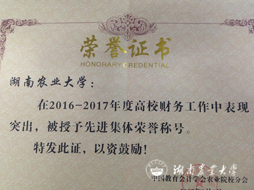 本网讯 (计财处 史瑞雯) 近日,中国教育会计学会农业院校分会在全体理事单位范围内开展了2016-2017年度财务管理先进集体评选活动。根据分会常务理事会议精神,经过专家组评审,湖南农业大学等10所农业院校被评为财务管理工作先进集体,并在2017年年会上受到表彰。