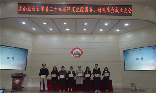研究生院副院长邬玉香宣读《关于成立湖南农业大学第二十九届研究生院团委、研究生会的通知》,刘寿涛、常白茹等77名同学被聘为第二十九届研究生院团委、校研究生会干部。