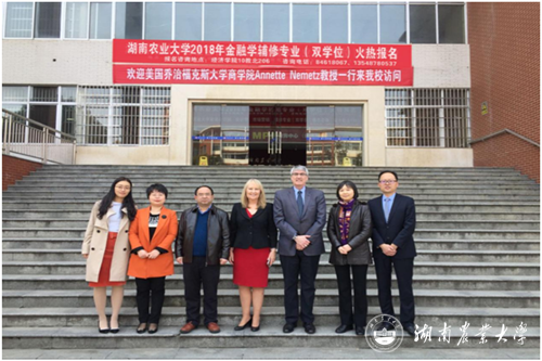 本网讯(经济学院 李立辉)2018年3月12日,美国乔治福克斯大学MBA项目主任、国际商务研修班主任Annette Nemetz 博士和乔治福克斯大学教育学院院长Marc Shelton 博士一行对湖南农业大学经济学院进行访问。