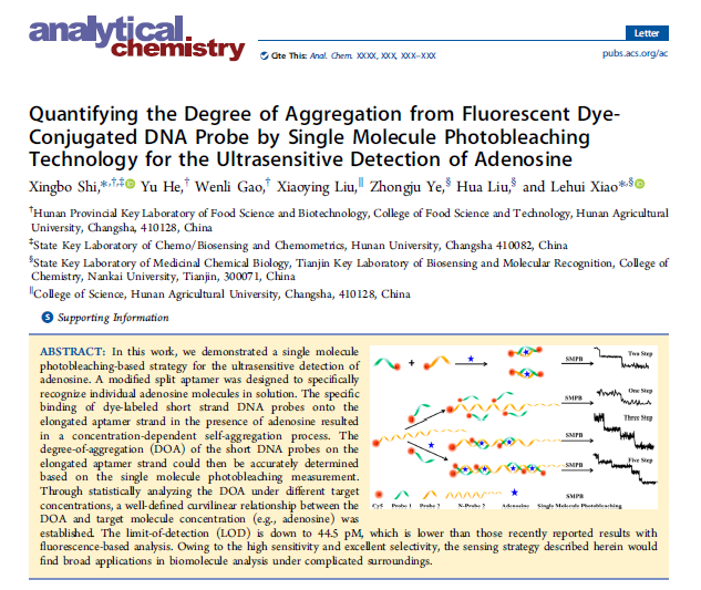 近日,湖南农业大学食品科技学院,食品科学与生物技术湖南省重点实验室石星波副教授以第一作者兼通讯作者,湖南农业大学为第一单位,在国际分析化学领域顶级学术期刊《Analytical Chemistry》发表了题为“Quantifying the Degree of Aggregation from Fluorescent Dye-Conjugated DNA Probe by Single Molecule Photobleaching Technology for the Ultrasensitive Detection of Adenosine”的研究论文。该论文巧妙设计“裂开型”核酸适配体的结构,利用单分子漂白技术,在单分子水平上考察荧光团聚体的团聚程度,根据荧光团聚程度与目标检测分子的相关性,计算目标分子的浓度。并以腺苷为检测对象,成功实现了皮摩尔级的高灵敏检测。该检测策略,只需要更改识别探针,就可以实现其他目标分子的检测,是一种普适性的高灵敏检测方法。