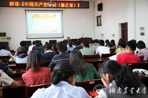 2017年10月24日通过了关于《中国共产党章程(修正案)》的决议,共修改107处,总纲部修改58处,条文部分修改49处。全体与会人员在农学院党委书记胡小元的带领下对《中国共产党章程》进行了全面、认真的学习。