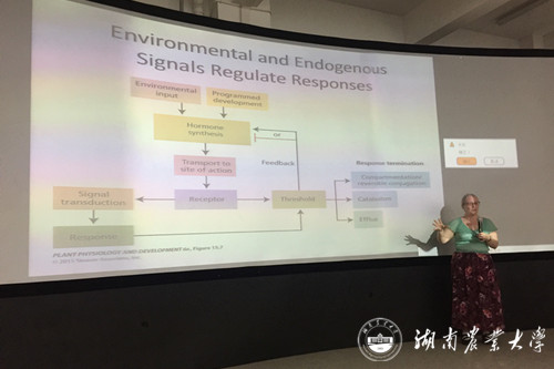 5月29日,在我校生物科学技术学院、道地药用植物规范化栽培与综合利用湖南省工程实验室、我校研究生院、国际交流与合作处和校科协,共同举办的生物科学技术学院研究生活动节SKY大讲堂系列学术报告会上,Angus Murphy教授和Wendy Peer副教授分别作了题为“Auxin movement in phototropic seedlings”和“The Role of Auxin Oxidation in Plant Growth and Development”的报告。两位教授的讲授内容丰富,图文并茂,深入浅出,生动形象,让与会师生对植物生长素有了更为系统和全面的认识,带来了重要启发。