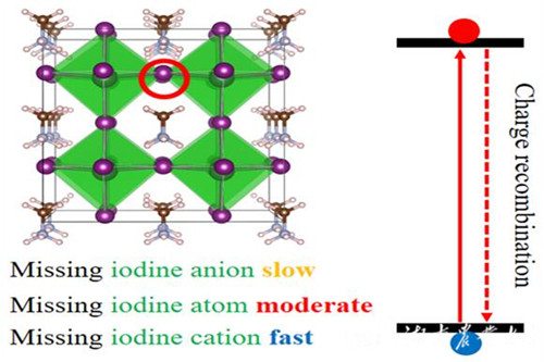 近期,理学院材料模拟与设计研究团队与美国南加州大学Oleg V. Prezhdo教授课题组开展合作,利用含时密度泛函理论结合非绝热动力学计算,对钙钛矿(CH3NH3PbI3)材料中碘空位缺陷不同氧化态对非辐射电子空穴复合的影响机制进行了详细探究。卤素空位缺陷是CH3NH3PbI3 中最普遍存在的缺陷类型。密度泛函理论计算表明,卤素空位缺陷不同氧化态很大程度上会影响带隙内陷阱态的形成。卤素阴离子空穴缺陷导致空位缺陷处带正电,金属阳离子Pb2+之间由于库伦排斥导致空位缺陷处Pb-Pb距离增大,带隙内不会形成陷阱态。而卤素阳离子空位导致空位缺陷处带负电,空位缺陷处Pb2+之间由于库伦吸引并相互作用形成Pb-Pb二聚体,导致带隙中形成深能级陷阱态;另一方面Pb-Pb二聚体的形成导致Pb空位缺陷的产生,相应的在价带顶附近位置也能观察到很浅的陷阱态。中性的卤素原子空位由于不会引入电荷态,Pb-Pb距离介于二者之间,同时也伴随着浅能级陷阱态的形成。此外,非绝热分子动力学模拟表明,卤素阴离子空位对载流子寿命影响较小,不会恶化钙钛矿电池器件的性能。中性的卤素因子空位加快电子空穴复合5倍左右,并且直接的电子空穴复合和陷阱态提供了等同的作用。卤素阳离子空位显著的加快电子空穴复合,大约两个数量级。浅能级和深能级陷阱态的同时存在使得空穴载流子避免直接与电子进行复合:先被俘获到浅能级陷阱态,再进一步被俘获到深能级陷阱态,最终与导带中电子进行复合,这也是卤素阳离子空位缺陷中电子空穴显著加快的根源。因此,通过调控钙钛矿材料的形成条件,控制体系的氧化态,避免中性和卤素阳离子空位缺陷的形成能很大程度上抑制非辐射复合损失通道,从而优化钙钛矿电池器件性能。