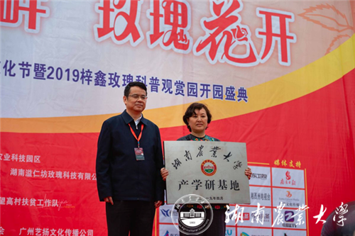 曾福生出席了花垣县第四届玫瑰文化节暨2019梓鑫玫瑰科普园开园活动,并代表学校为湖南溢仁坊梓鑫玫瑰科技有限责任公司进行了湖南农业大学产学研基地授牌,与洁宝集团签订了合作共建望高村“产学研”基地框架协议。在讲话中,曾福生指出我校与洁宝集团合作共建望高村“产学研”基地是进一步深化校地校企合作、巩固脱贫成效、助力乡村振兴的有效举措,希望以此次合作为契机,不断开创共谋发展、校地双赢新局面。
