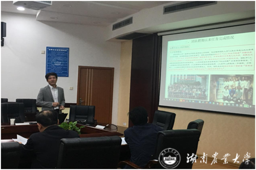 侯德兴教授汇报团队受聘五年来团队在教学、科研、学科建设、团队建设、人才培养、学术交流等方面所做的工作。受聘五年来,侯教授及团队成员成功申报国家级科研项目14项,科研经费近2700万元;以湖南农业大学为第一单位发表论文120多篇,其中SCI收录论文62篇,累计折合影响因子达173.42;获授权国家专利10项;主持获得湖南省科技发明奖二等奖1项,湖南省自然科学奖二等奖和三等奖各1项,湖南省科技进步奖二等奖2项、三等奖1项,作为参与人获得国家科学技术进步奖二等奖1项;为本科生讲授20多门专业课程;招收学术研究生30多人,毕业硕士研究生21人,毕业博士研究生5人;成功申报湖南畜禽安全生产协同创新中心及湖南家禽安全生产工程技术研究中心等平台;积极促进国际学术交流,牵头主办2次国际学术研讨会。圆满完成合同各项指标任务。