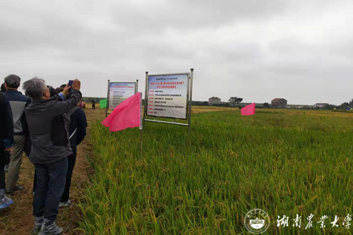 本网讯(农学院 徐华勤 龙攀)10月10日—12日,国家重点研发计划项目“粮食主产区主要气象灾变过程及其减灾保产调控关键技术”中期检查暨现场观摩会在岳阳农科院麻塘试验站举行。此次观摩会由我校承办,岳阳农业科学研究院协办。来自中国科学院地理科学与资源研究所孙九林院士、农业部科技发展中心副主任聂善明、检查组组长河南农科院郭天财研究员、山东农业大学王振林教授、南京农业大学姜东教授、中国农科院作物所张卫健研究员等检查组专家对岳阳试验站现场情况进行了检查,来自中国农业大学、中国农科院环境与可持续发展研究所、中国科学院遥感与数字地球研究所、中国水稻研究所、辽宁农科院等19家单位的课题、子课题负责人等近百人共同观摩了试验现场。我校科技处处长陈光辉、农学院副院长傅志强、农学院邹应斌教授、岳阳农科院院长晏云华应邀出席。