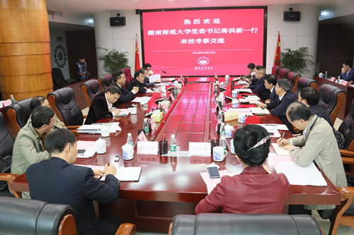 本网讯(党政办 何振宇)10月25日下午,湖南师范大学党委书记蒋洪新、副校长匡乐满、纪委书记唐贤清等一行来我校调研。调研座谈会在文渊馆党委会议室举行,校党委书记陈弘主持。