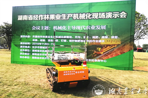本网讯(机电工程学院 胡文武)11月7日,由湖南省农机事务中心主办的 “机械化主导现代农业发展”湖南省经作林果业生产机械化现场演示会在长沙望城雷锋镇百果园举行。