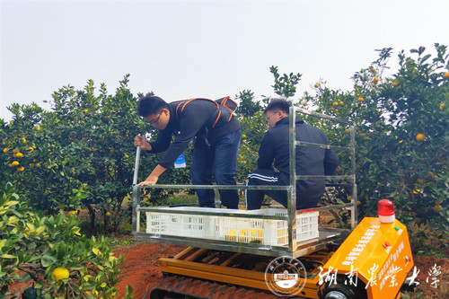 2018年,湖南省人民政府启动了农业产业千亿产业发展项目,我校机电工程学院承担了油菜、茶叶、水果、水产、中药材等千亿产业机械化发展规划研究及相关装备研发,学院蒋蘋教授团队承担水果千亿产业采收技术与关键装备的研究。由胡文武老师主持研制的履带自走式智能水果辅助采摘平台,参与本次现场演示会。该设备以“科技保护绿水青山,轻松收获金山银山”为研发理念,采用电池供电,电机驱动行驶。结合姿态监测传感器、电动-伺服电控液压、微型计算机控制、智能控制算法、无线通信等先进技术,实现货箱伺服调平与平台升降、坡道牵引力控制、坡道自主安全防护等功能,机器实现了水平±15°范围、俯仰30°范围内的货箱自适应调平,作业举升高度1.5m,满足200kg载荷在30°坡道的水果安全转运,有效的提高作业与水果转运的安全性,提升了水果采摘的效率,降低了农民的劳动强度,为绿色农业的发展提供了技术支撑。