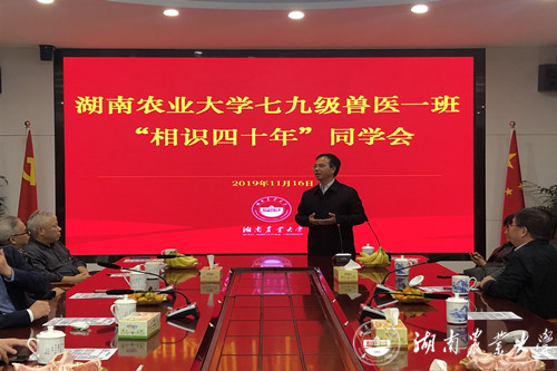 在“相识四十年”师生座谈会上,陈弘代表学校全体师生对校友返校表示热烈欢迎,向长期以来情系母校、关心支持母校建设与发展的广大校友们表示崇高的敬意。该班原团支书,现任娄底职业技术学院党委书记李文莲代表同学们向母校汇报了毕业后三十六年的学习工作情况。该班原班长,军事医学科学院中国人民解放军疾病预防控制所毒理学评价研究中心主任、博士生导师彭双清为母校赠送了著作。双峰县农办主任周永根朗诵了自己特意为此次聚会创作的诗作《同学情》。校友们回顾了当年的求学经历,表达了对母校的感谢,祝福母校越办越好,并倡议校友们为母校的蓬勃发展贡献自己的力量,回报母校的培养。校友们表示“经历30多年的风风雨雨,母校的名字一直在默默的支持着我们,给我们温暖,给我们力量。母校的烙印已经深深地印在了我们人生的旅途当中。四年师生谊,永远农大情”。