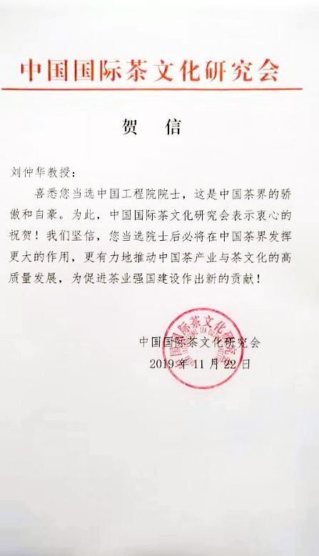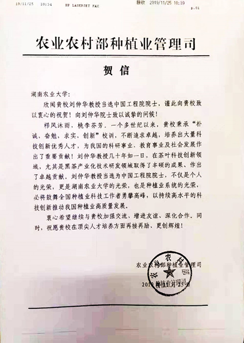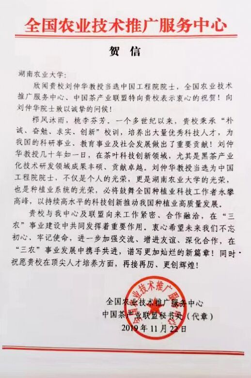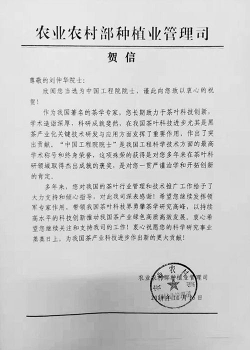本网讯(宣传部)近日,农业农村部种植业管理司向湖南农业大学和刘仲华院士发来贺信,祝贺我校刘仲华教授当选中国工程院士。贺信高度赞扬了刘仲华教授潜心科研、无私奉献的精神以及为我国产业科技进步尤其是黑茶产业化关键技术研发与应用方面做出的重要贡献,希望刘仲华院士继续发挥领军专家作用,带领我国茶叶科技界勇攀茶学研究高峰,以持续高水平的科技创新推动我国茶产业绿色高质高效发展。