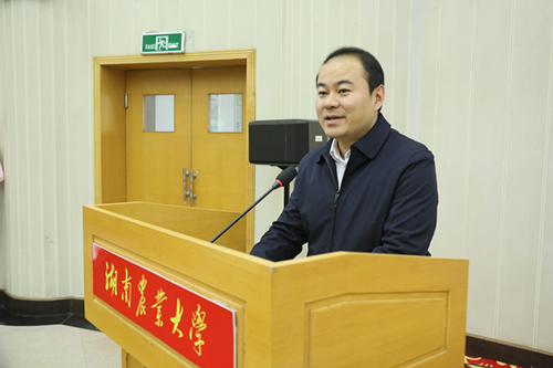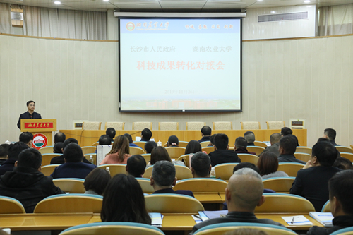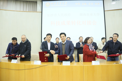本网讯(宣传部)11月26日下午,长沙市政府与我校联合举办科技成果转化对接会。长沙市委副书记朱健,学校党委书记陈弘,副校长曾福生、邹冬生出席会议。会上我校12项科技成果现场签约转化,签约金额共计1746.7万元。其中,“植物提取物及其兽用终端产品研究开发”项目签下1000万元“大单”。我校被授牌“长沙市技术转移转化基地”。