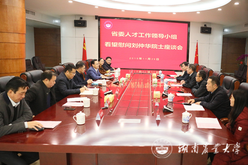 本网讯 (党政办 何振宇)11月29日下午,受湖南省委书记、省委人才工作领导小组组长杜家毫委托,省科技厅厅长童旭东等一行来校看望新当选院士刘仲华教授。校长邹学校,副校长曾福生、段美娟,相关单位负责人参加座谈。