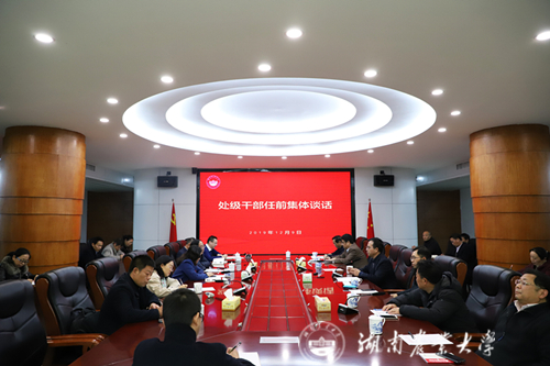 本网讯(宣传部 庹炼 王薇薇)12月9日,学校党委组织召开新任处级干部任前集体谈话。校党委书记陈弘、校长邹学校和纪委书记方逵对新任处级干部提出明确要求和希望。全体在校校领导、党委委员参加,陈弘主持谈话。